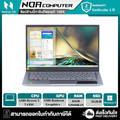 หน้าจอแสดงผลขนาด 14.0" ระดับ FHD IPS/ CPU AMD Ryzen 5 7430U Processor/ AMD Radeon Graphics (Integrated)/SSD 512GB RAM 16GB LPDDR4X/ Windows 11 Home/ Microsoft Office Home & Student 2021
