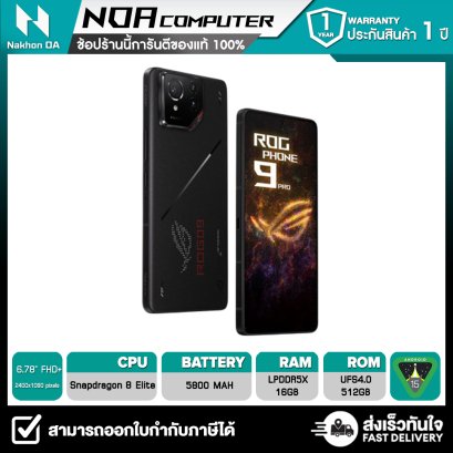 สัมผัสประสบการณ์การเล่นเกมที่ดีที่สุด ด้วย ROG Phone 9 Pro กับเจเนอเรชันใหม่ที่เป็นผลงานชิ้นเอกของ ROG ที่ผสมผสานการเล่นเกมระดับสูงเข้ากับดีไซน์ที่ทันสมัยพร้อมอัตลักษณ์ของเกมเมอร์ได้อย่างลงตัวที่สุด ประสิทธิภาพสูงสุด ด้วยซีพียูใหม่ Snapdragon® 8 Elite พร้อม RAM 16GB / ROM 512GB ระบบระบายความร้อน GameCool9 ที่อัปเกรดใหม่ รีดความร้อนออกจาก SoC ได้ดีกว่าเดิม เร่งสปีดด้วย X-Mode ที่ปลดขีดจำกัดในการเล่นเกมให้สูงขึ้น มอบฟีลลิ่งแบบคอนโซล ด้วย AirTrigger แบบ Ultrasonic หน้าจอรองรับ 185Hz แบบ LTPO กับความสว่าง 2500 nits แบตเตอรี่ 5800 mAh รองรับการชาร์จไร้สาย 15W Qi 1.3 สัมผัสเกมมิ่งไลฟ์สไตล์กับ AniMe Vision และ AniMe Play ลูกเล่นพิเศษบนฝาเครื่องที่เป็นเอกลักษณ์เฉพาะ ROG Phone กล้องระดับโปรฯ ที่ให้ระบบกันสั่น 6-Axis Hybrid Stabilizer 4.0 ใหม่ล่าสุด ใช้งานได้มั่นใจ ป้องกันละอองน้ำและฝุ่นระดับ IP68