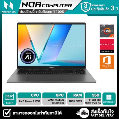 CPU : AMD Ryzen 7 260 / RAM : 16GB DDR5 (On Board) / SSD : 512GB PCIe 4/NVMe M.2 SSD / Display : 16.0" WUXGA (1920 x 1200) 16:10 aspect ratio / GPU : AMD Radeon Graphics (Integrated) / Windows 11 Home / Office Home 2024 / Microsoft 365 Basic / warranty : 3 Years