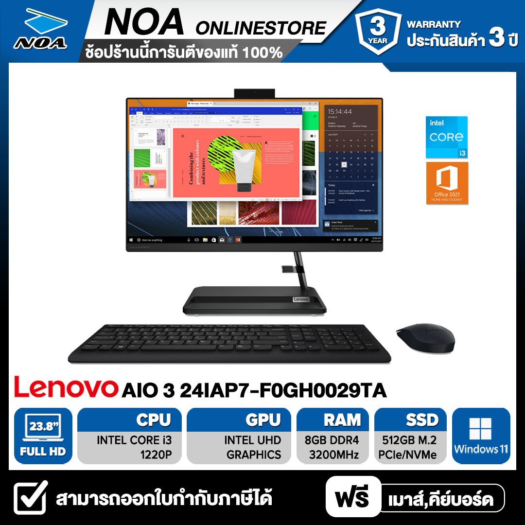 Intel Core i3-1220P/ 8GB (8GBx1) DDR4 3200MHz/512GB PCIe/NVMe M.2 2280/ 23.8" Full HD WVA Non-Touch/ Integrated Intel UHD Graphics/ Windows 11 Home + Office Home & Student 2021/รับประกัน 3YEARS ONSITE SERVICE