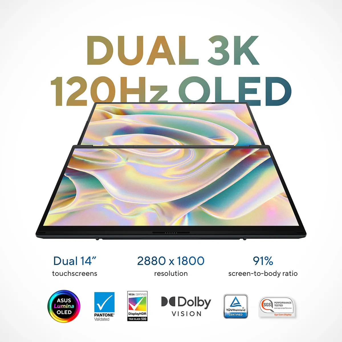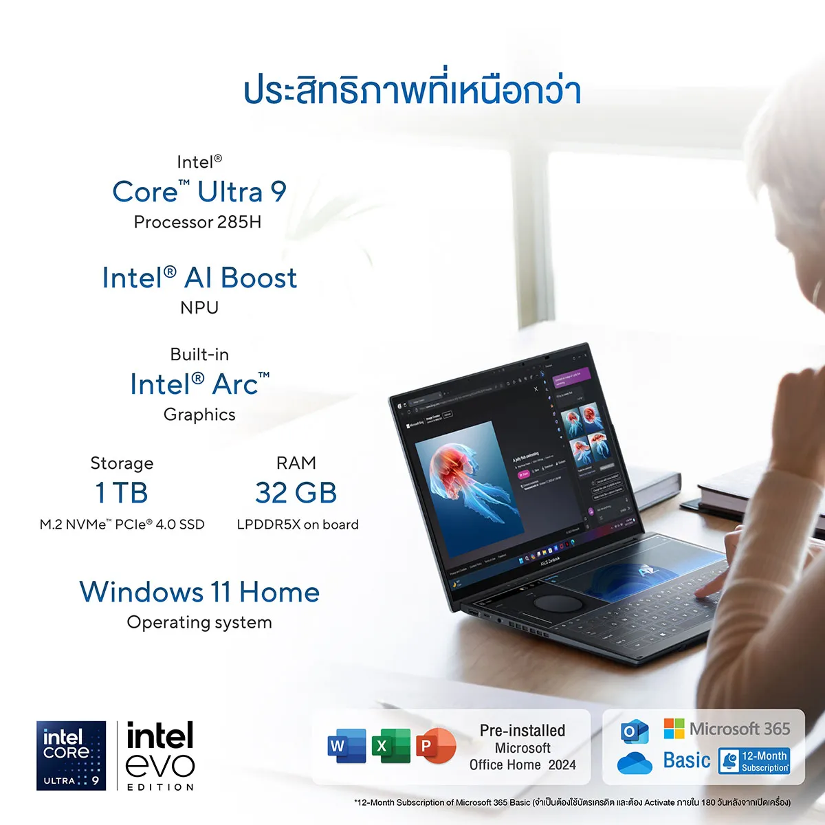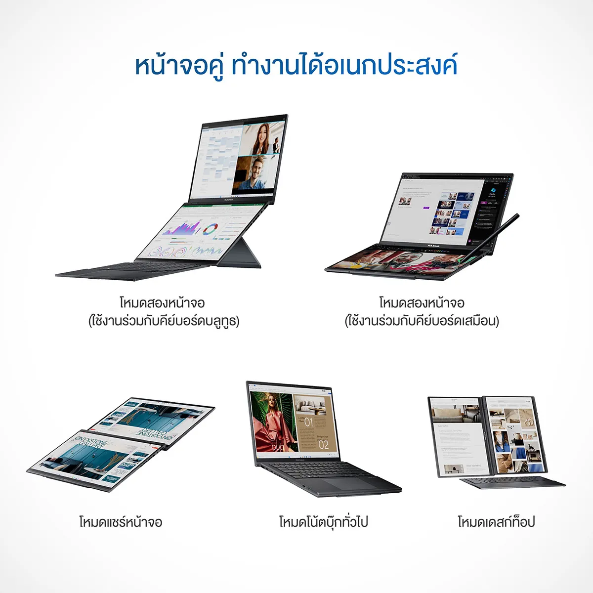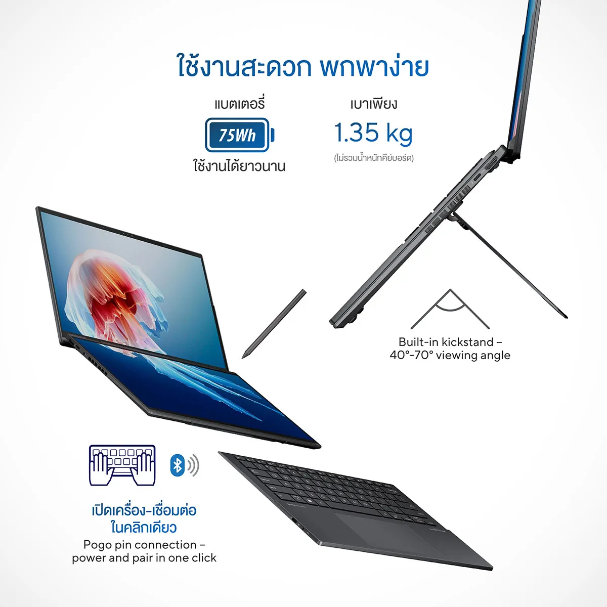 ASUS Zenbook DUO UX8406 โน้ตบุ๊กนวัตกรรมที่มีสองหน้าจอ OLED 3K มอบประสบการณ์การใช้งานที่ไม่เหมือนใคร หน้าจอหลักขนาด 14 นิ้ว และหน้าจอที่สองขนาดเท่ากัน ช่วยเพิ่มพื้นที่การทำงานและ Multitasking ได้อย่างมีประสิทธิภาพ ขับเคลื่อนด้วย Intel Core Ultra 9 285H RAM 32GB และ SSD 1TB ประสิทธิภาพสูง เหมาะสำหรับผู้ที่ต้องการความสร้างสรรค์และประสิทธิภาพในการทำงาน