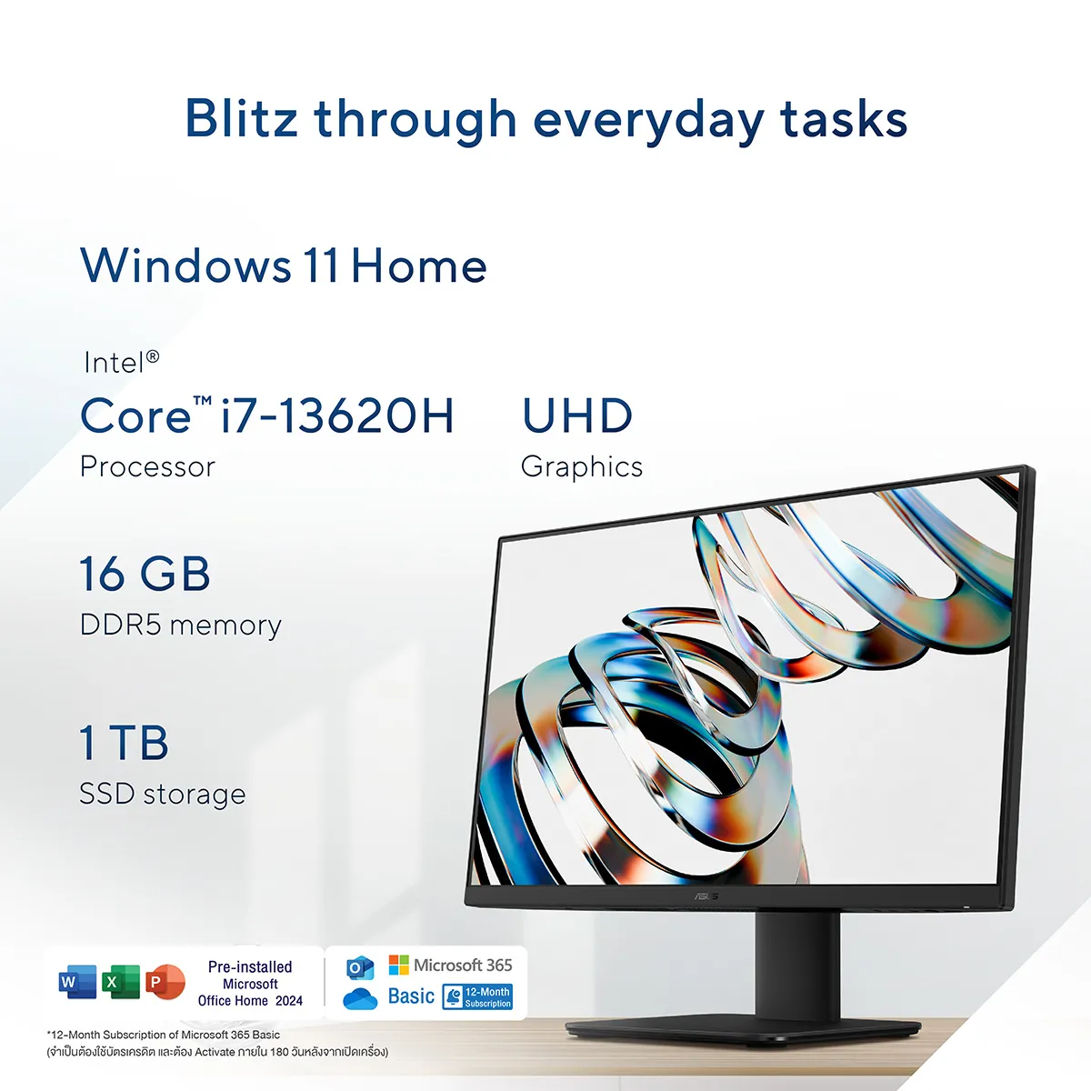 1. หน้าจอความละเอียด Full HD (1920 x 1080) สีสันสมจริง 100% sRGB ขนาด 27 นิ้ว 100Hz สัดส่วนหน้าจอต่อตัวเครื่อง 93% 2. เร็วแรง ทำงานลื่น ด้วยขุมพลัง Intel® Core™ i7-13620H 3. มองจากมุมไหนก็เห็นสีชัดไม่ผิดเพี้ยนด้วยเทคโนโลยี wide-view บนจอ widescreen ที่มุมมองกว้างถึง 178 องศา 4. พอร์ตการเชื่อมต่อที่มีให้อย่างครบครัน 5. เชื่อมต่อไร้สายได้รวดเร็ว WiFi 6E และ Bluetooth 5.3 6. กล้องคมชัด 1080p FHD รองรับการสแกนใบหน้าผ่าน Windows Hello ไมค์พร้อมฟังก์ชันตัดเสียงรบกวนและลำโพงรอบทิศทาง Dolby Atmos 7. มาพร้อม Windows 11 Home , Microsoft Office Home 2024 และ 12-month subscription of Microsoft 365 Basic (จำเป็นต้องใช้บัตรเครดิต และต้อง Activate ภายใน 180 วันหลังจากเปิดเครื่อง) 8. ประกันดูแลถึงบ้าน 3 ปีเต็ม (Next business day warranty ในเขตกรุงเทพ และปริมณฑล พร้อมให้บริการภายใน 1 วัน หลังเรียกรับบริการ) และประกันอุบัติเหตุ 1 ปีแรก 9. ตัวเครื่องมาพร้อมเมาส์และ คีย์บอร์ดมีสาย พร้อมใช้งานทันที