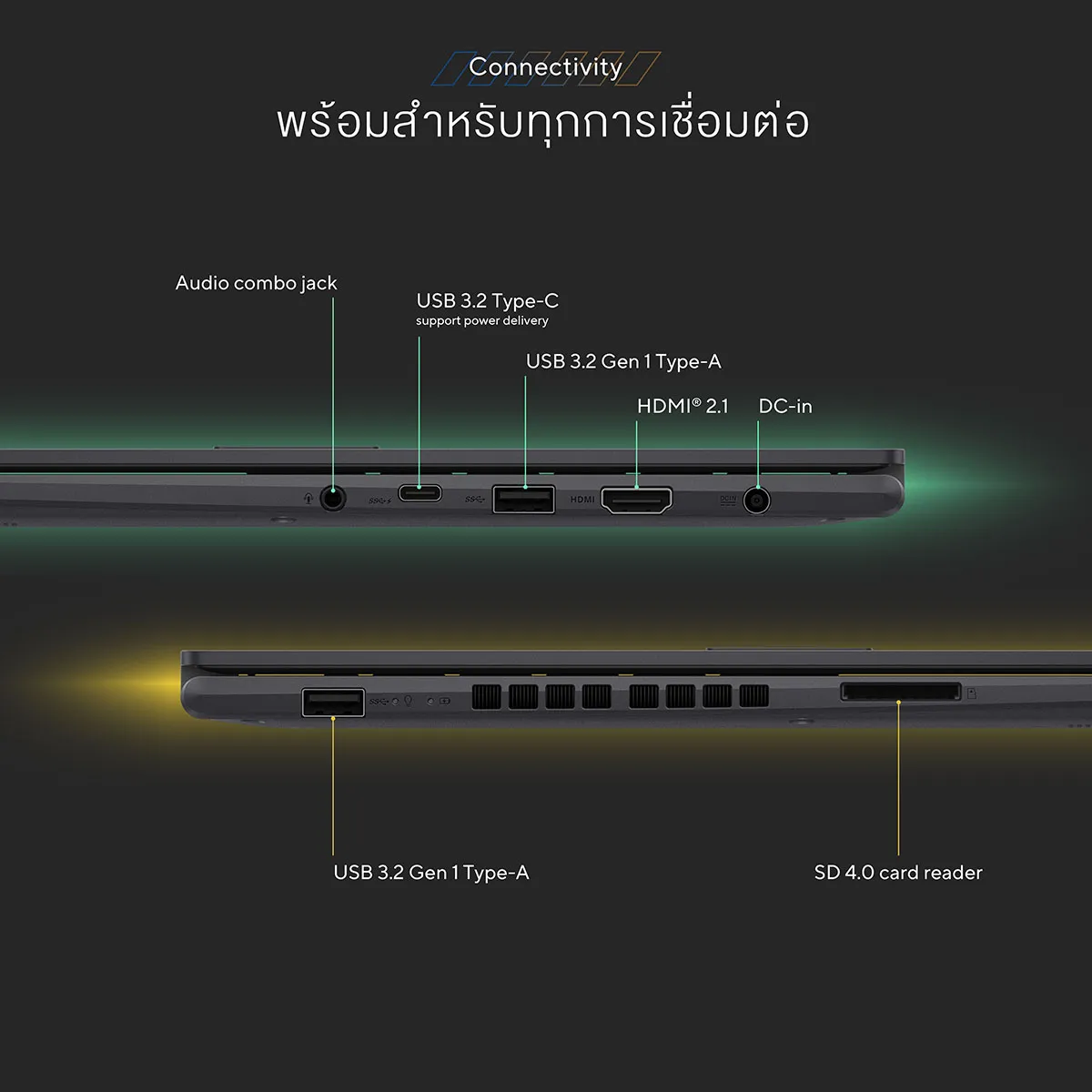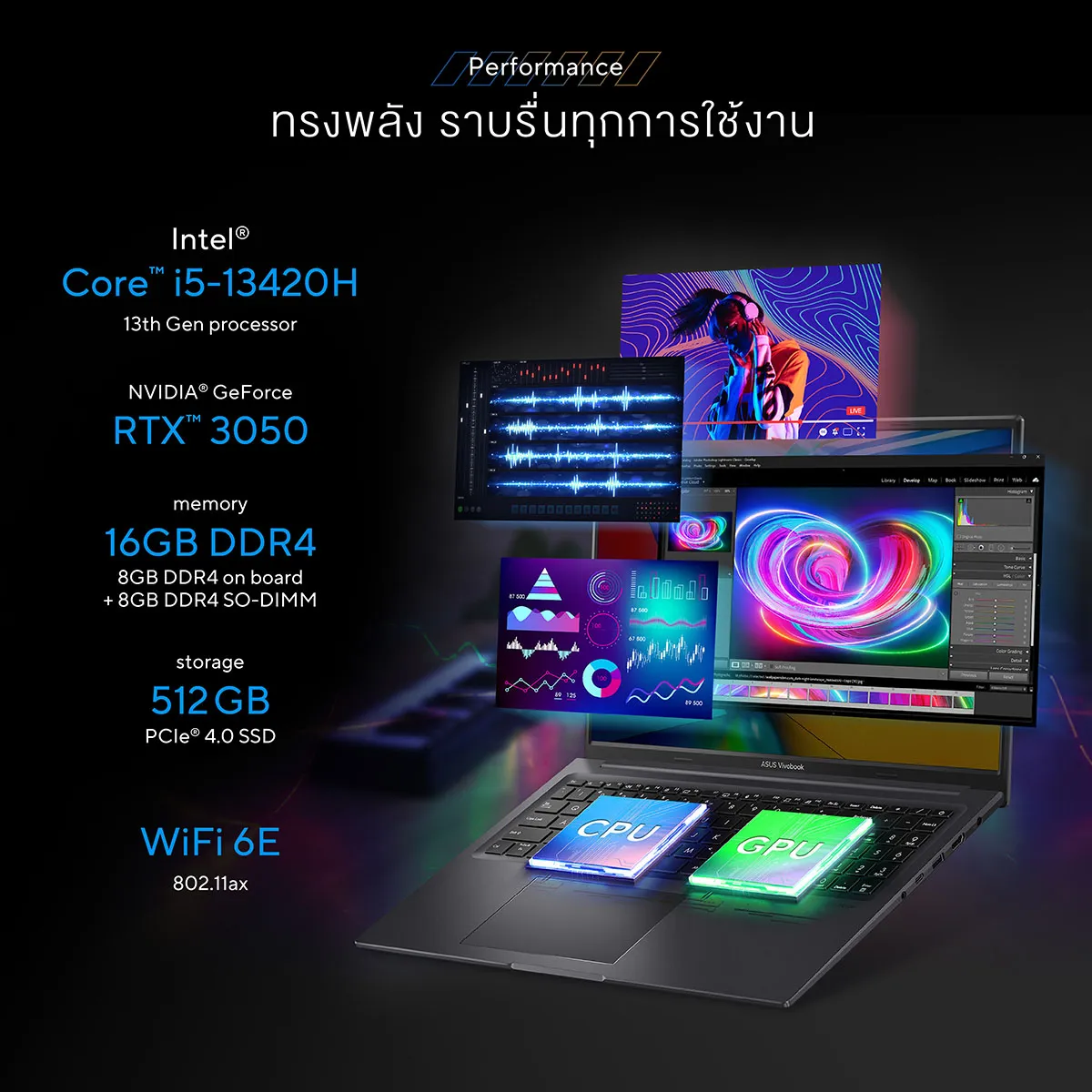 1. ประสิทธิภาพสูง ด้วย Intel® Core™ i5-13420H 2. กราฟิกการ์ด NVIDIA® GeForce RTX™ 3050 3. จอกว้างเต็มตากับขนาด 16" ความละเอียด WUXGA (1920 x 1200), 144Hz 4. บานพับแบบวางราบได้ 180° ช่วยให้การแชร์หน้าจอกับคนรอบข้างได้ง่ายดาย 5. คีย์บอร์ดรองรับไฟ Backlight สะดวกสำหรับใช้งานตอนเวลากลางคืน 6. พอร์ตการใช้งานพื้นฐานครบถ้วน ทั้ง USB 3.2 Gen 1 Type-C และ USB Type A, HDMI 2.1 พร้อมพอร์ต SD 4.0 card reader 7. ให้คุณมีสุขอนามัยที่ดี กับ Antibacterial Guard ที่เคลือบสารพิเศษที่พื้นผิวส่วนคีย์บอร์ด ป้องกันเชื้อโรคต่างๆ ได้อย่างมีประสิทธิภาพและยาวนาน 8. มาพร้อม Windows 11 Home 9. ได้รับการรับประกันมาตรฐาน On-Site Service 2 ปี, International warranty 2 ปีและ Perfect warranty 1 ปีแรก