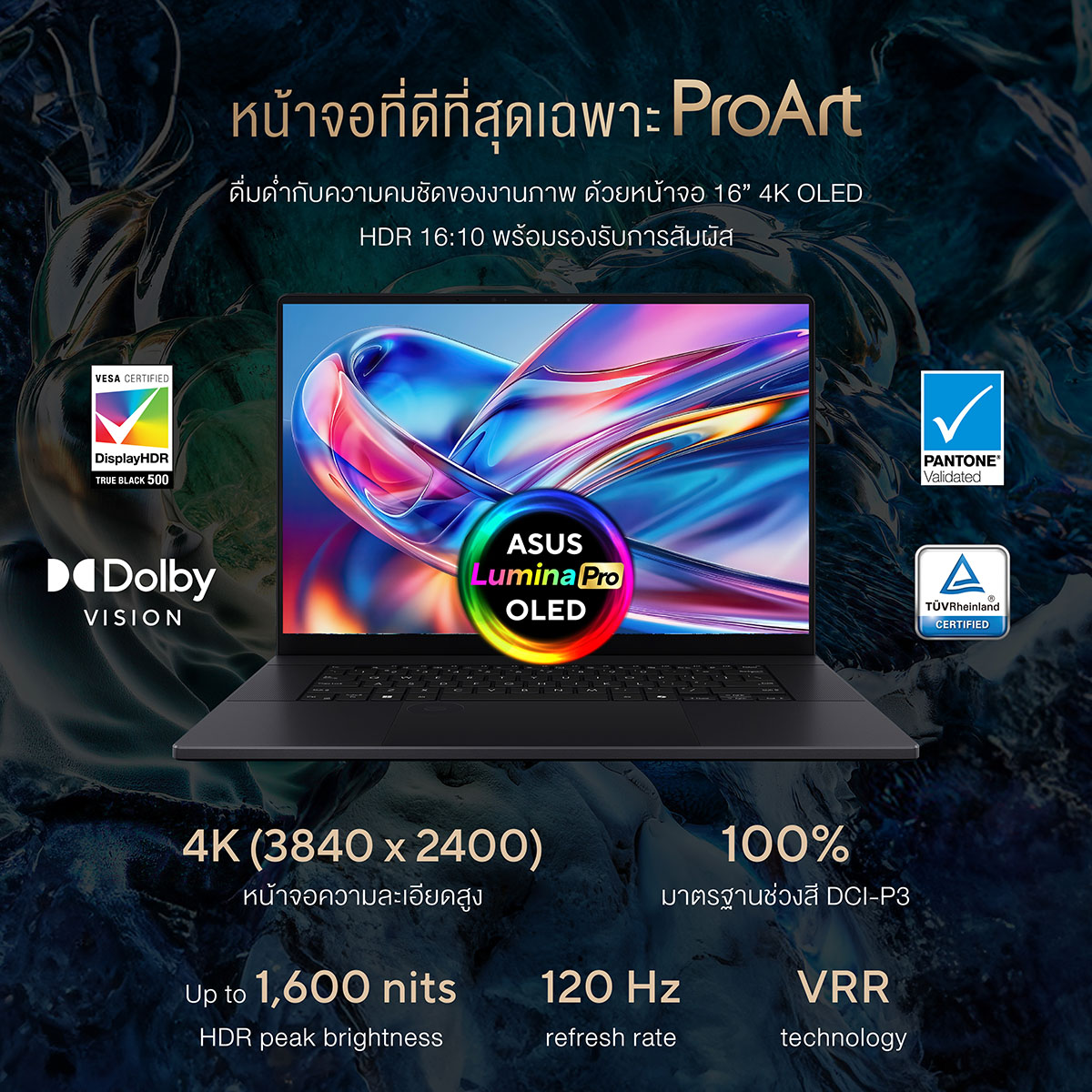 | Display | 16.0" 3840x2400 (4K) 16:10, OLED, 120Hz, 0.2ms, 1600nits HDR peak brightness, Glossy display, 100% DCI-P3 color gamut, Pantone Validated, 88% Screen-to-body ratio, Touchscreen With stylus support |
