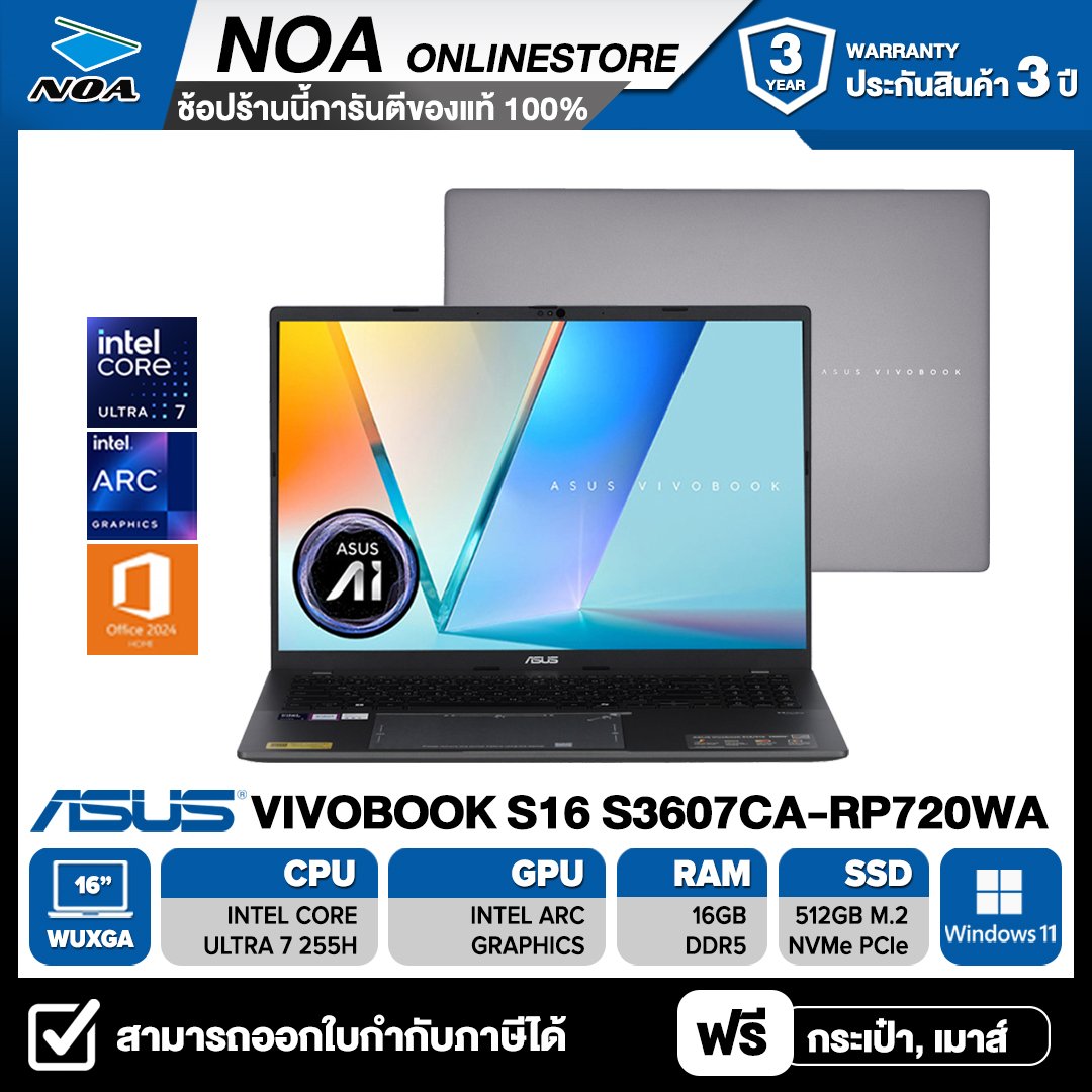 [กรอกโค้ด BSC500 ลดทันที 500.-] NOTEBOOK (โน้ตบุ๊ก) ASUS VIVOBOOK S16 S3607CA-RP720WA 16-inch WUXGA/CORE ULTRA 7 255H/16GB/SSD 512GB/ WINDOWS 11+OFFICE รับประกันศูนย์ไทย 3ปี